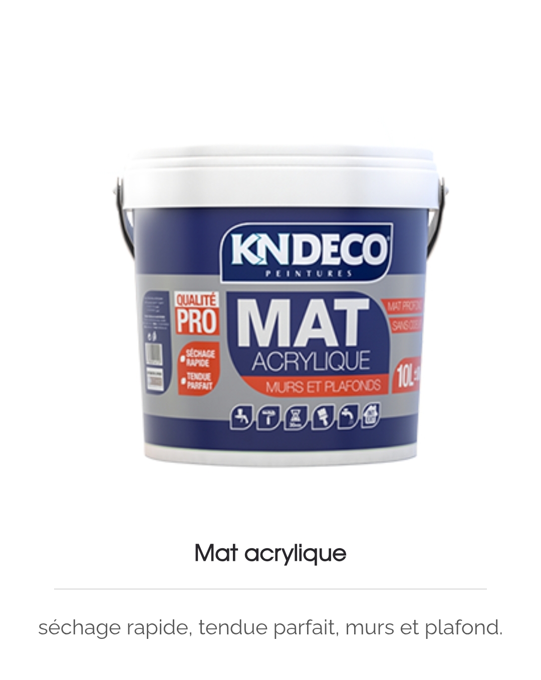Le Mat Acrylique Kndeco est une peinture mate de décoration, à base de résine acrylique en dispersion aqueuse, spécialement conçue pour les murs et plafonds intérieurs.